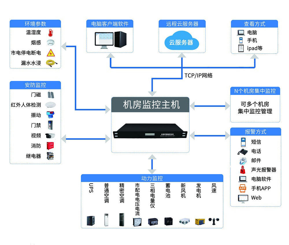 隨著信息網(wǎng)絡(luò)技術(shù)的不斷發(fā)展,各類規(guī)模大小不等,設(shè)備種類、數(shù)量不同的網(wǎng)絡(luò)設(shè)備機(jī)房廣泛分布于用戶各分支機(jī)構(gòu)所在地域,由于欠缺與運(yùn)行網(wǎng)絡(luò)的規(guī)模體系相對(duì)稱的運(yùn)維系統(tǒng),數(shù)量眾多的無(wú)人值守機(jī)房的物理運(yùn)行環(huán)境狀況、動(dòng)力配電狀況、設(shè)備運(yùn)行狀況、人員活動(dòng)狀況以及消防狀況的變化包括可能出現(xiàn)的危急狀況,均無(wú)法得到及時(shí)的發(fā)現(xiàn)和處理,也就很難被有效預(yù)見(jiàn)、防范和避免。因此,一套完善的機(jī)房環(huán)境監(jiān)控系統(tǒng)對(duì)于機(jī)房、IDC等場(chǎng)所非常重要。